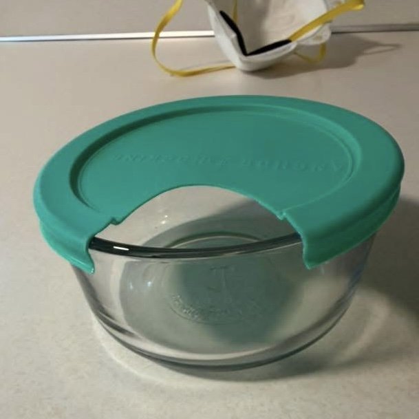 First, get a two-cup Pyrex-type bowl with a lid. Here is a link to some (I get paid nothing to suggest these, they’re just what I use: